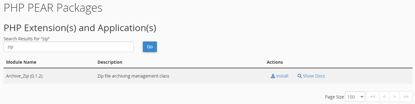 3 - Novamente na tela principal do seu painel de controle na aba Softwares, selecione a opção PHP PEAR Packages. Na nova tela que irá aparecer, escreva "zip" no campo de procura e clique em Go como mostrado na imagem a seguir.